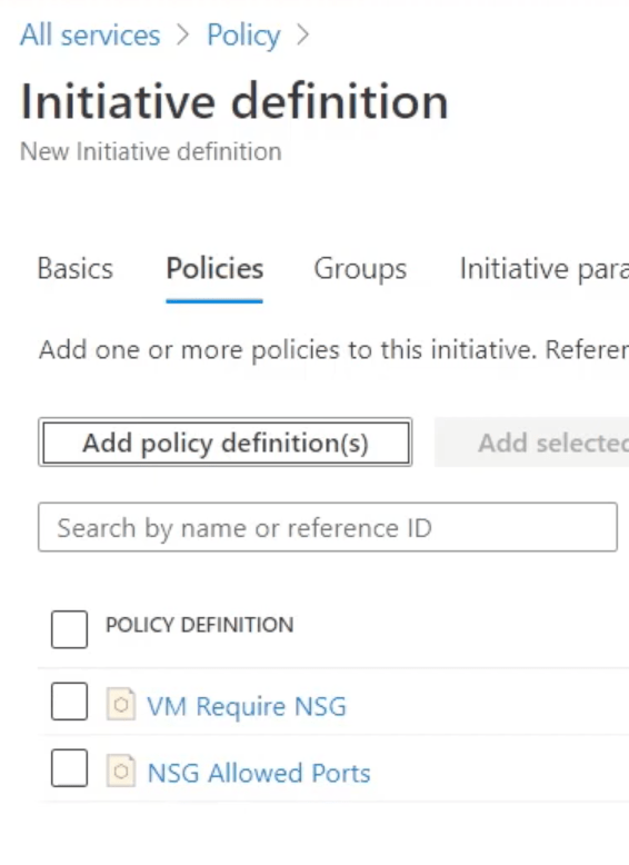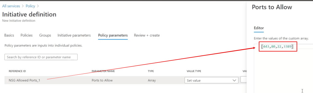 The 2nd example policy above required a list of ports, so when you create an initiative you must provide the array/list of ports: