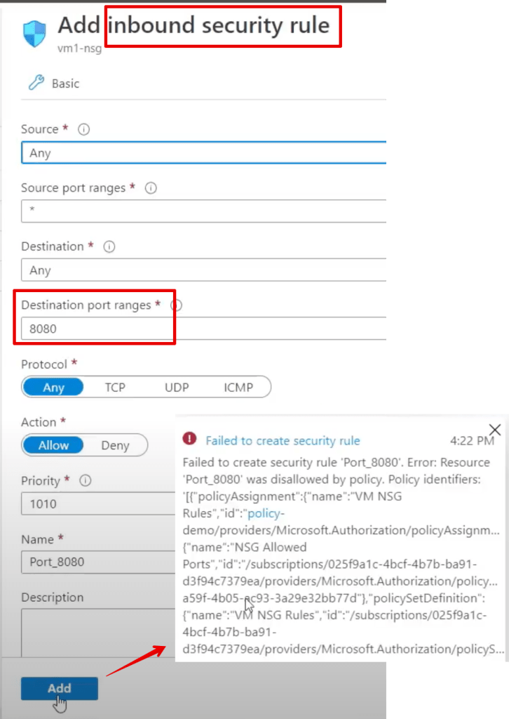 As another example, try to edit an existing NSG and add a port that’s out of the defined range above: